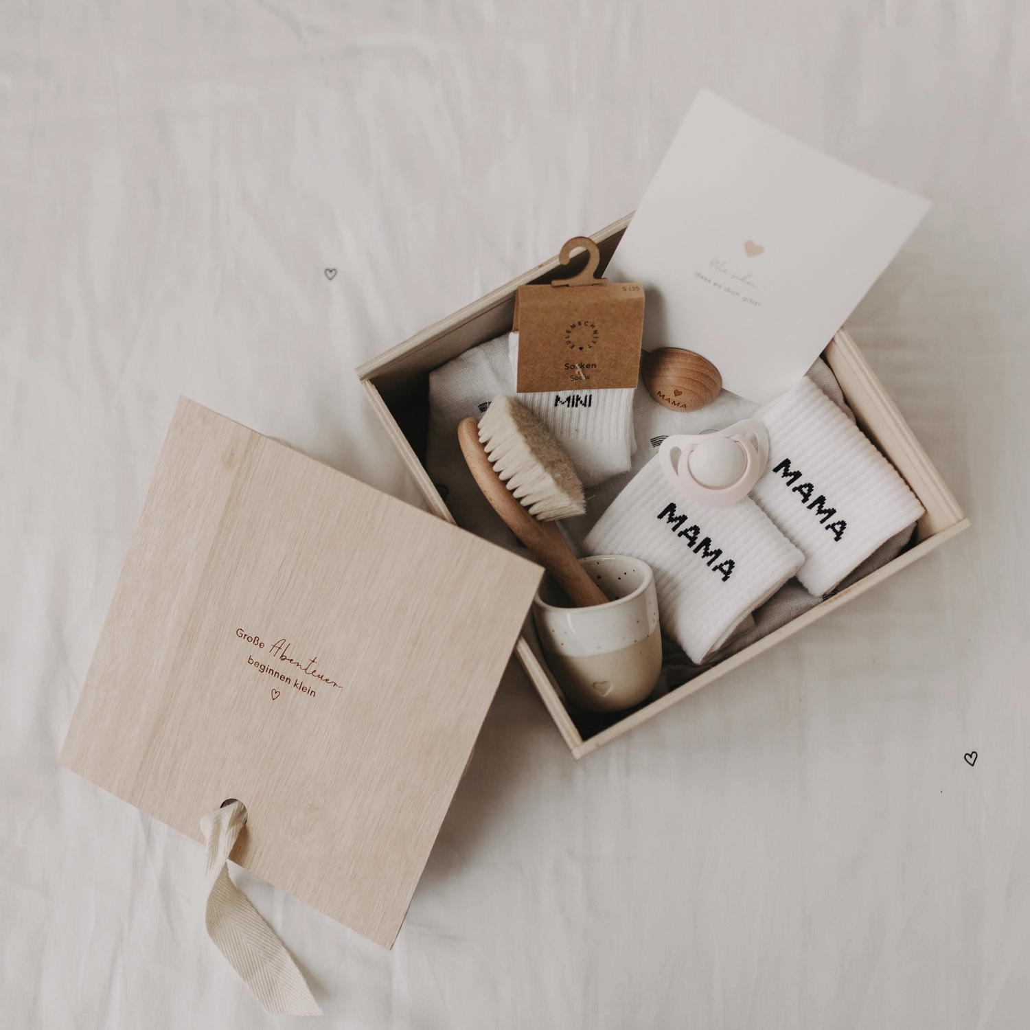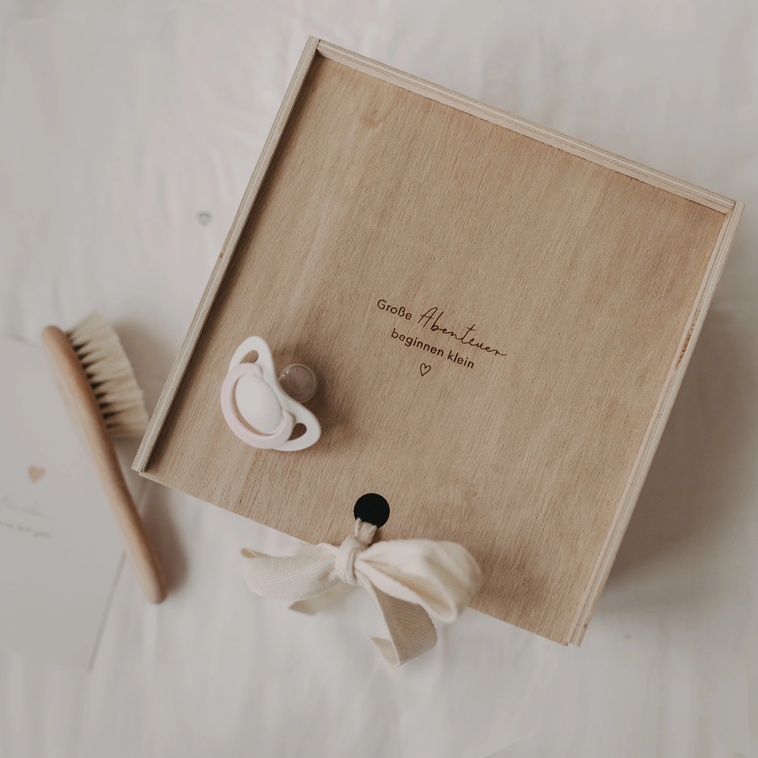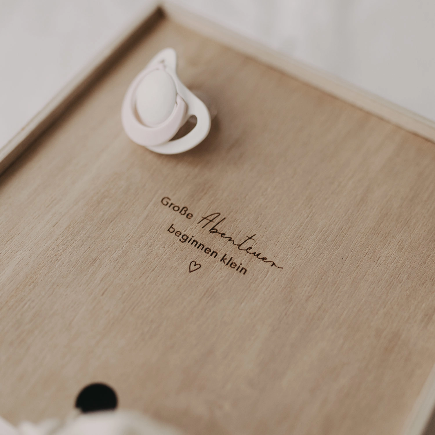 Die Gravur "Große Abenteuer beginnen klein ❤" ist in liebevoller Schrift gestaltet. Auf der Rückseite der Erinnerungsbox ist zusätzlich das typische Eulenschnitt-Logo zu sehen.