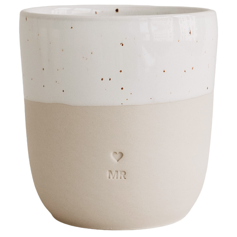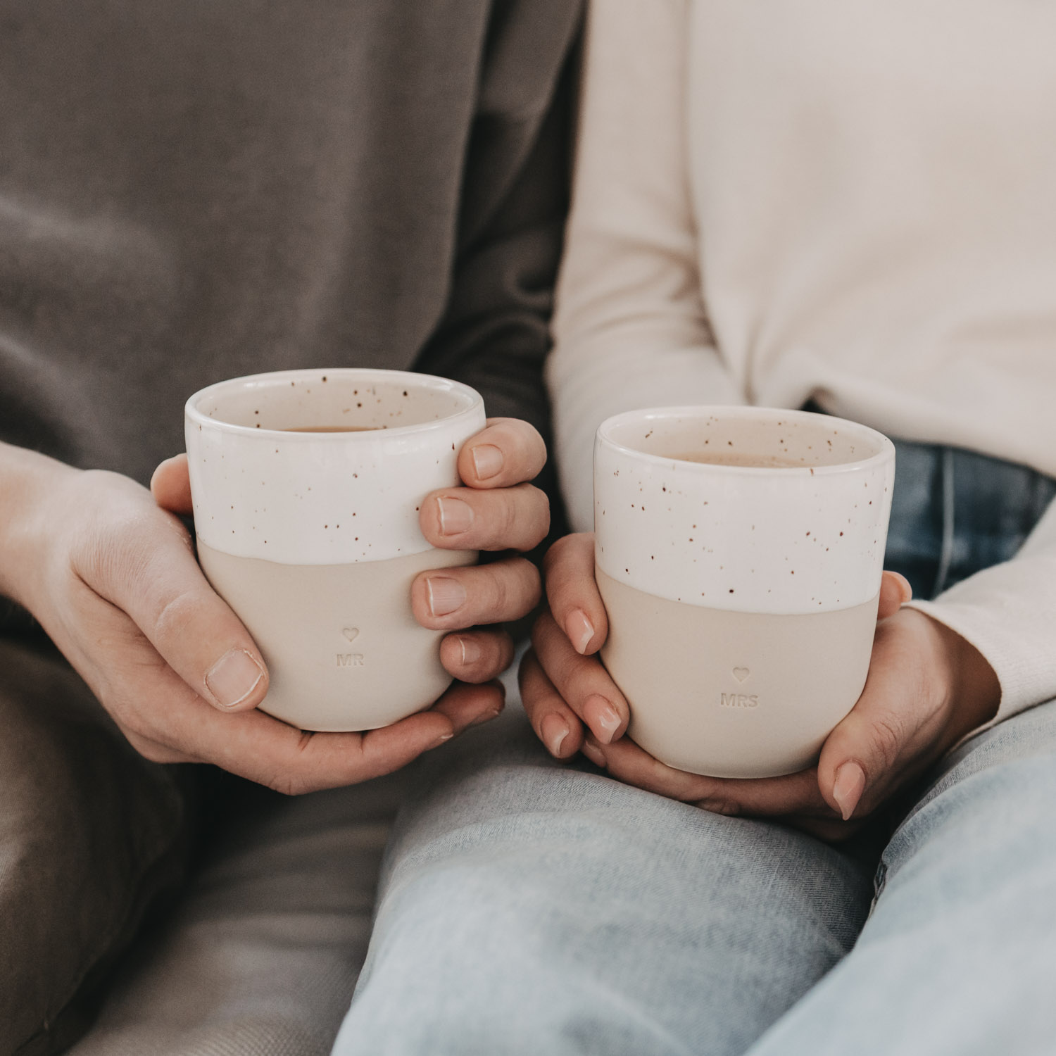 Eulenschnitt Kaffeebecher mit Aufschrift MR | Hochzeitsgeschenk aus Steingut | für 320 ml