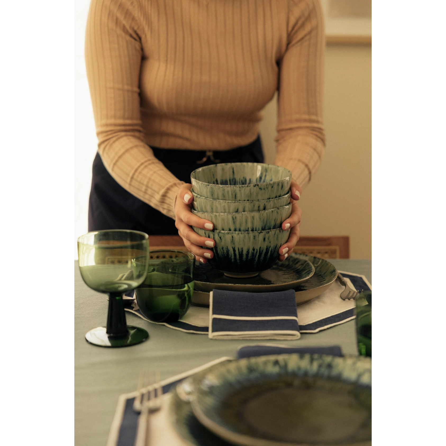 Die Serie Azeitona von Grain by Grain kombiniert das warme, natürliche Braun des Tons mit einer Glasur aus verschiedenen, grünen und blauen Tönen. Alle Steingut-Artikel der Marke werden handgefertigt und sind teilglasiert. Der untere Bereich sowie die Unterseite der Müslischalen sind nicht glasiert. Die Teilglasur trägt zur Schonung der Ressourcen bei und sorgt damit für einen spannenden Mix aus unterschiedlicher Haptik. Jede Schale der Serie Azeitona besitzt das Markenlogo auf der Unterseite und ist selbstverständlich spülmaschinenfest und mikrowellengeeignet.